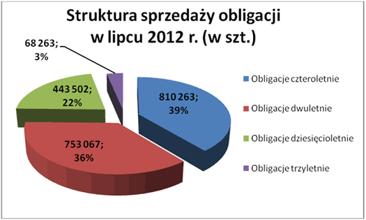 W lipcu 2012 roku nabyto 810 263 szt. obligacji czteroletnich i były to najczęściej kupowane obligacje detaliczne w tym okresie. Największym zainteresowaniem cieszyły się one w województwach; mazowieckim (230 465 szt.), śląskim (105 248 szt.) i wielkopolskim (81 265 szt.). Poprzez e-kanały (Internet, konto Inteligo, telefon) sprzedano 16,7 proc. czteroletnich, detalicznych papierów skarbowych. Zdecydowaną większość (486 964 sztuk) nabyto w pakietach dużych (liczących powyżej 1000 szt.).