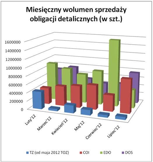 Spośród uplasowanych na rynku czterech rodzajów detalicznych papierów skarbowych, największym zainteresowaniem cieszyły się obligacje czteroletnie, co jest wynikiem niecodziennym, gdyż od kilku lat najpopularniejsze były na przemian obligacje dwuletnie i dziesięcioletnie. W ubiegłym miesiącu to jednak obligacji czteroletnich (COI) inwestorzy kupili najwięcej przeznaczając na nie 81,02 mln PLN. Spośród pozostałych papierów skarbowych najczęściej kupowane były obligacje dwuletnie (DOS), których wartość sprzedaży wyniosła 75,30 mln PLN. Następne w kolejności pod względem sprzedaży znalazły się obligacje dziesięcioletnie (EDO), z emisji których pozyskano w ubiegłym miesiącu 44,35 mln PLN i obligacje trzyletnie (TOZ), na które inwestorzy przeznaczyli 6,82 mln PLN. Łączna wartość uplasowanych na rynku obligacji detalicznych w lipcu 2012 wyniosła zatem 207,5 mln PLN.