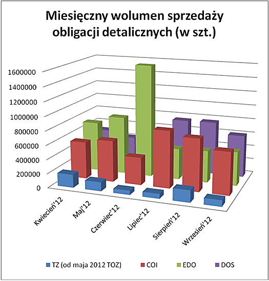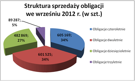 Spośród wszystkich dostępnych we wrześniu 2012 r. czterech rodzajów detalicznych papierów Skarbu Państwa, najchętniej wybieranymi przez inwestorów indywidualnych były obligacje czteroletnie. Wartość ich łącznej sprzedaży wyniosła w minionym miesiącu 60,5 mln PLN. To już trzeci miesiąc z rzędu gdy ten rodzaj papierów skarbowych plasuje się w ścisłej czołówce sprzedaży. Niewiele gorszy wynik osiągnęły obligacje dwuletnie, które nabyto za 60,2 mln PLN. Tym samym był to drugi, najchętniej wybierany rodzaj obligacji detalicznych. Wartość sprzedaży dziesięcioletnich papierów skarbowych z serii EDO wyniosła 48,3 mln PLN, a obligacji trzyletnich 8,9 mln PLN.
