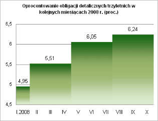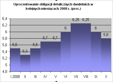 W październiku 2008 r. Ministerstwo Finansów oferowało inwestorom indywidualnym cztery typy obligacji skarbowych: dwuletnie DOS1010, trzyletnie TZ0811, czteroletnie COI1012 oraz dziesięcioletnie EDO1018. Sprzedaż była realizowana za pośrednictwem placówek PKO BP, przez telefon oraz przez Internet. W sumie inwestorzy kupili prawie 11,2 mln sztuk papierów, każdy o wartości nominalnej 100 zł. To niemal trzykrotnie więcej, niż we wrześniu tego roku i niemal sześciokrotnie więcej, niż w październiku 2007 r. Takiego zainteresowania obligacjami nie było od lat!