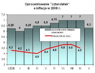Eksperci przypominają, że jeszcze w ubiegłym roku nic nie wskazywało, że papiery czteroletnie zyskają swoich zwolenników. Ich sprzedaż w całym 2007 r. wyniosła 142,3 mln zł. Po dziesięciu miesiącach tego roku jest to już 678,2 mln zł. - W momencie, kiedy inflacja spadała, wielu osobom wydawało się, że obligacje czteroletnie nie były zbyt opłacalne, gdyż papiery o stałym oprocentowaniu przynosiły wyższy dochód. Obecnie, kiedy dynamika cen jest wyższa, odsetki od czterolatek także rosną. Wydaje się więc, że Polacy docenili mechanizm indeksowania inflacją - mówi Aneta Kopera.