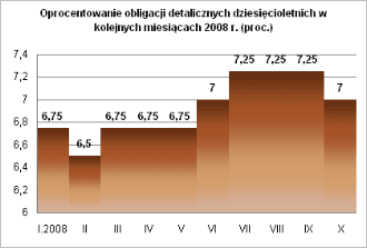 W październiku nabywców znalazły papiery dziesięcioletnie o wartości nominalnej 218,6 mln zł (wobec 53,4 mln zł we wrześniu). Ich oprocentowanie jest najwyższe spośród wszystkich papierów detalicznych proponowanych przez Ministerstwo Finansów i wynosiło 7-proc. w pierwszym, rocznym okresie odsetkowym. W ten sposób resort premiuje długi okres oszczędzania. Odsetki, jakie przynoszą papiery dziesięcioletnie, są co rok kapitalizowane, co dodatkowo zwiększa ich zyskowność. Ich wypłata odbywa się wraz z wykupem po 10 latach. Oprocentowanie zmienia się co 12 miesięcy i zależy od stopy inflacji, powiększonej o marżę 2,75 proc. Możliwe jest wycofanie się z inwestycji, wtedy kwota należnych odsetek pomniejszana jest o 1 zł każdej sztuki posiadanej obligacji (podobny mechanizm przewidziano w przypadku papierów dwu- i czteroletnich).