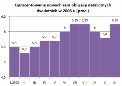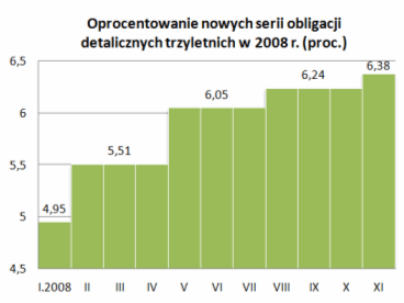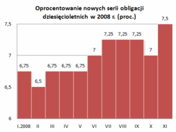 W listopadzie 2008 r. Ministerstwo Finansów oferowało inwestorom indywidualnym cztery typy obligacji skarbowych: dwuletnie DOS1110, trzyletnie TZ1111, czteroletnie COI1112 oraz dziesięcioletnie EDO1118. Sprzedaż była prowadzona za pośrednictwem placówek PKO BP, przez telefon oraz przez Internet. W sumie inwestorzy kupili ponad 5,6 mln sztuk papierów, każdy o wartości nominalnej 100 zł. To o 1,6 mln sztuk więcej, niż w listopadzie 2007 r.