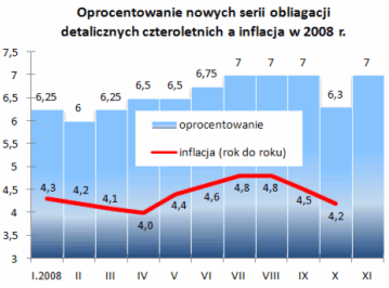 Eksperci przypominają, że jeszcze w ubiegłym roku nic nie wskazywało, że papiery czteroletnie zyskają swoich zwolenników. Ich sprzedaż w całym 2007 r. wyniosła 142,3 mln zł. Po jedenastu miesiącach tego roku jest to już 740,9 mln zł. - W momencie, kiedy inflacja była niska, wielu osobom wydawało się, że obligacje czteroletnie nie były zbyt opłacalne, gdyż papiery o stałym oprocentowaniu przynosiły wyższy dochód. Kiedy dynamika cen okazała się wyższa, odsetki od czterolatek także wzrosły - mówi Aneta Kopera.