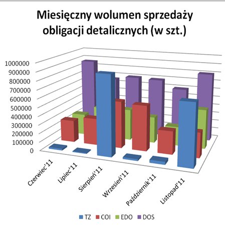Znane już są najnowsze dane dotyczące sprzedaży obligacji detalicznych emitowanych przez Skarb Państwa. W listopadzie 2011 roku, inwestorzy indywidualni kupili ponad 2 mln sztuk, skierowanych specjalnie do nich skarbowych papierów dłużnych, za łączną kwotę ponad 224,9 mln PLN. Największą popularnością cieszyły się dwuletnie papiery skarbowe, choć na uwagę zasługuje również fakt wysokiej sprzedaży obligacji trzyletnich.