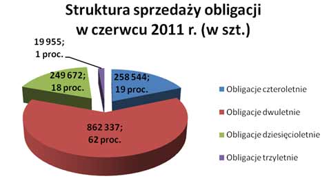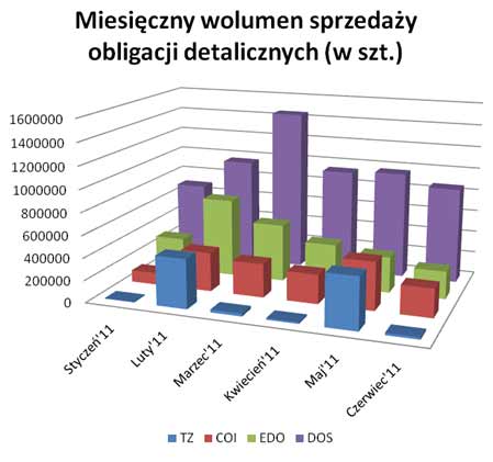 W czerwcu 2011 roku inwestorzy nabyli łącznie 1 390 508 sztuk obligacji detalicznych, przeznaczając na ten cel kwotę 138 997 964,84 PLN. Podobnie jak w poprzednich miesiącach, najczęściej kupowane były obligacje dwuletnie (DOS0613) o stałym oprocentowaniu wynoszącym 4,5 proc. rocznie. Na te papiery skarbowe inwestorzy przeznaczyli 86 175 361,20 PLN. Mierząc popyt, kolejnym rodzajem obligacji detalicznych były "czterolatki", których wartość sprzedaży w ubiegłym miesiącu wyniosła 25 851 692,70 PLN. Wyprzedziły one obligacje dziesięcioletnie, które w czerwcu br. sprzedano za 24 967 200 PLN. Ostatnie pod względem popytu były obligacje trzyletnie, które zostały nabyte przez inwestorów za 2 003 710,94 PLN, przy czym był to drugi miesiąc sprzedaży "trzylatek" z serii TZ0514.