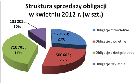 Największym zainteresowaniem cieszyły się obligacje dziesięcioletnie, które od lutego br. są najchętniej kupowanymi detalicznymi papierami wartościowymi Skarbu Państwa. W kwietniu 2012 r. inwestorzy przeznaczyli na ich zakup kwotę 71 mln PLN. Drugi miesiąc z rzędu wzrosła sprzedaż obligacji czteroletnich, które kupiono za sumę 53 mln PLN. Ogólnie, łączna wartość zakupu wszystkich obligacji detalicznych Skarbu Państwa wyniosła w kwietniu 2012 r. prawie 193 mln PLN.