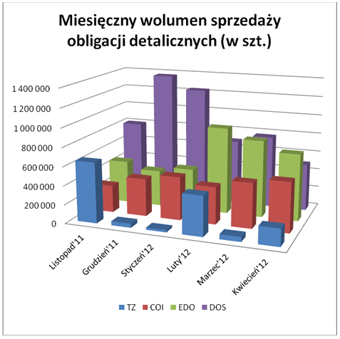 Kwiecień 2012 r. był trzecim i zarazem ostatnim miesiącem emisji "trzylatek" typu TZ (obligacji rynkowych emitowanych w cyklach trzymiesięcznych - w lutym, maju, sierpniu i listopadzie). W maju zastąpione zostały nowymi obligacjami oszczędnościowymi typu TOZ emitowanymi podobnie jak pozostałe - co miesiąc. W kwietniu sprzedano 185 203 szt. obligacji TZ. Za pomocą e-kanałów (Internet, konto Inteligo, telefon) sprzedano 3 proc. zakupionych "trzylatek". Zdecydowana większość (89,3 proc.) została kupiona w dużych pakietach, liczących powyżej 1000 sztuk.
