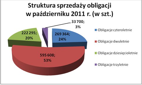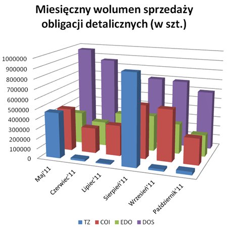 W październiku 2011 roku inwestorzy indywidualni przeznaczyli na zakup skierowanych do nich obligacji detalicznych kwotę 112 096 700,00. Podobnie jak w ubiegłych miesiącach, najczęściej kupowane były obligacje dwuletnie z serii DOS1013 o stałym oprocentowaniu wynoszącym 4,5 proc. rocznie. Na zakup tych papierów skarbowych inwestorzy przeznaczyli 59,6 mln PLN. Pod względem popytu na drugim miejscu uplasowały się obligacje czteroletnie z serii COI1015, które kupione zostały za kwotę 26,9 mln PLN. Obligacje dziesięcioletnie, które oferują najwyższe oprocentowanie sięgające w pierwszym roku odsetkowym 5,75 proc, nabyte zostały za kwotę 22,2 mln PLN. Jako ostatnie pod względem popytu uplasowały się obligacje trzyletnie, głównie za sprawa tego, że październik był trzecim i ostatnim miesiącem emisji "trzylatek" z serii TZ0814.
