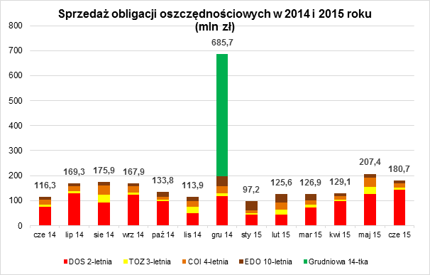 W czerwcu, podobnie jak w maju, obligacje oszczędnościowe cieszyły się dużym zainteresowaniem. Sprzedaż obligacji o wartości 180,7 mln zł to drugi najwyższy wynik w tym roku i o 25% wyższy od średniej miesięcznej sprzedaży od początku roku. Wyraźny trend wzrostowy utrzymał się w przypadku obligacji dwuletnich. Ich sprzedaż stanowiła niemal 80% wszystkich sprzedanych obligacji i była najwyższa od stycznia 2014 roku.