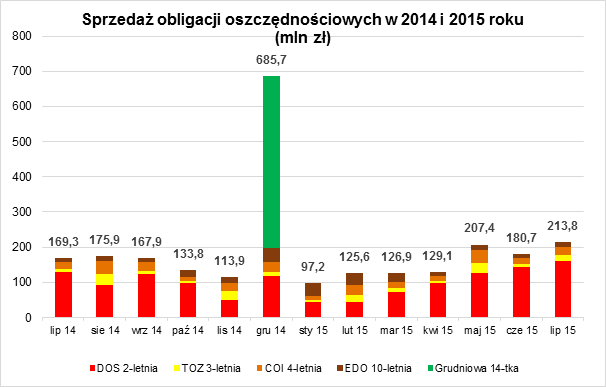 Najbardziej popularnymi papierami pozostają obligacje 2-letnie. Wartość ich sprzedaży wyniosła w lipcu 161 mln zł i jest to najwyższa miesięczna sprzedaż od stycznia zeszłego roku. Udział obligacji 2-letnich w strukturze sprzedaży wyniósł 75,4%. Drugimi najpopularniejszymi papierami dłużnymi były 4-latki (10,8% udział), na kolejnych pozycjach uplasowały się 3-latki (8,1%) oraz 10-latki (5,7%).
