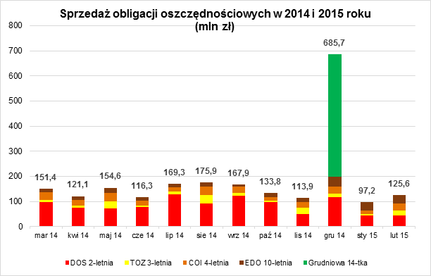 W lutym 2015 r. nabywcy indywidualni zakupili obligacje skarbowe o wartości nominalnej 125,6 mln zł. Najchętniej wybierane były 2-letnie papiery wartościowe, ale największy wzrost sprzedaży dotyczył obligacji 3-letnich.