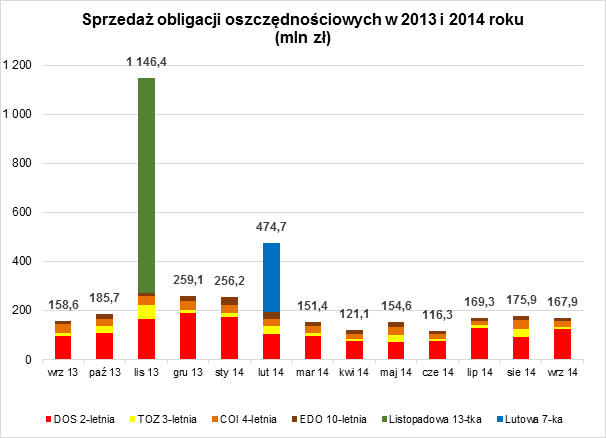 We wrześniu 2014 roku sprzedano obligacje DOS0916 o wartości nominalnej 122,6 mln zł w tym 157,5 tys. zł w ramach Konta IKE-Obligacje. Cena jednej obligacji w okresie sprzedaży wynosiła 100 zł. Oprocentowanie obligacji ustalono na poziomie 2,60%. W drodze zamiany zakupiono obligacje dwuletnie o wartości nominalnej 90,9 mln zł, co stanowiło 74,1% sprzedaży. Promocyjna cena zamiany wynosiła 99,60 zł.